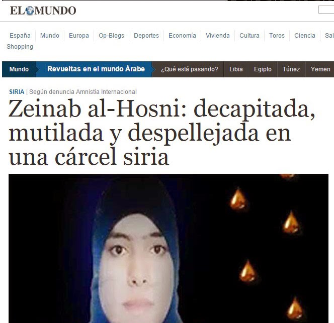 El primero reprodujo un cable de Reuters titulado: Zainab al Hosni: decapitada, mutilada y despellejada en una cárcel siria. 9