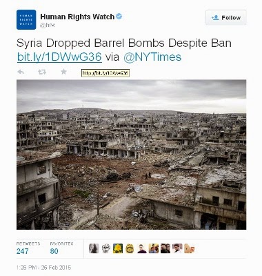 Según HRW el Gobierno sirio lanza bombas de barril sobre esa ciudad de Siria (Kobane), a pesar de la prohibición. Cita al New York Times como fuente de su aseveración. Pero resulta que el propio New York Times publicó esa misma imagen el 12 de febrero de 2015, la organización «humanitaria» lo hizo por twitter el 26, e indicaba que: