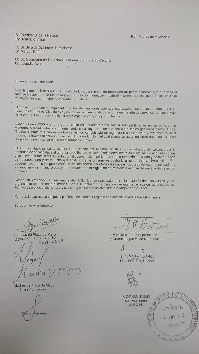 Los organismos de derechos humanos de la República Argentina queremos compartir con vuestra institución nuestra preocupación por el futuro del Archivo Nacional de la Memoria que funciona en el emblemático predio de lo que fuera el ex centro clandestino de detención Escuela de Mecánica de la Armada (ESMA).