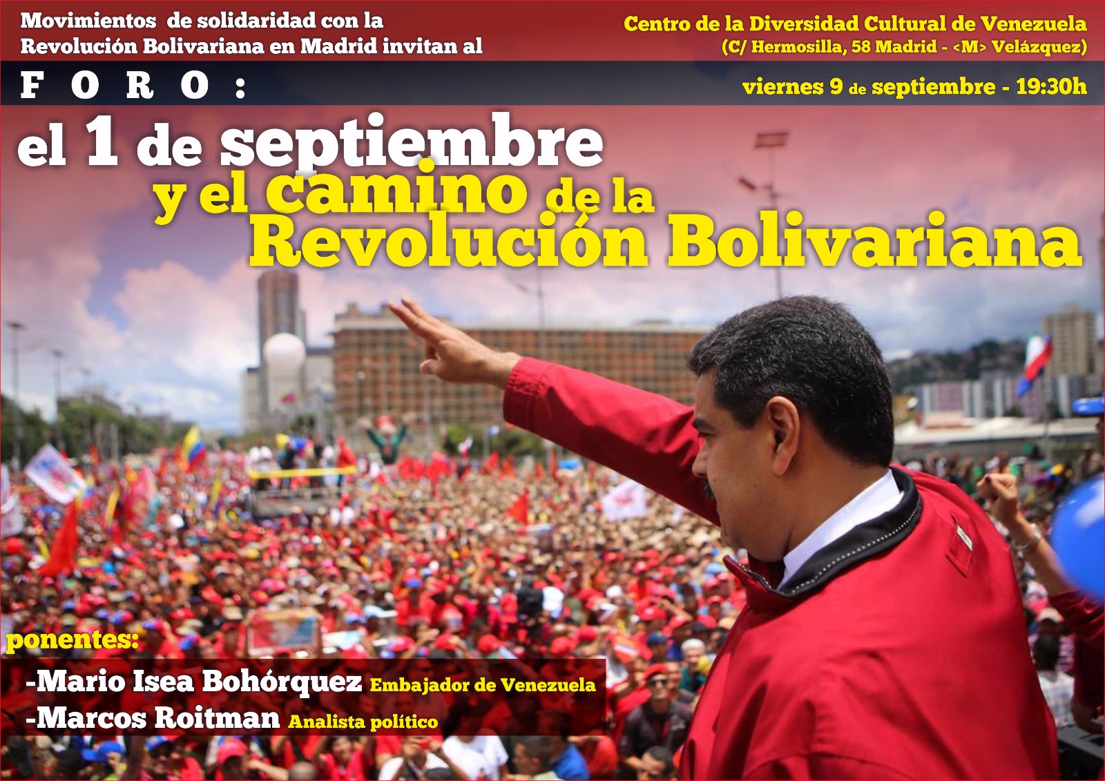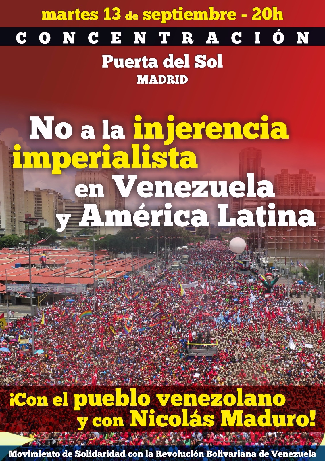 El Movimiento de Solidaridad con la Revolución Bolivariana convoca al pueblo madrileño y a las clases trabajadoras a una concentración para mostrar su apoyo al pueblo venezolano en momentos en que desde las oligarquías locales, en connivencia con el gran capital trasnacional y sus medios de comunicación lacayos y con la amenaza de intervención militar de los EEUU, se está intentando forzar de manera fraudulenta la expulsión de su legítimo presidente, Nicolás Maduro, a través de un procedimiento revocatorio que pretende ignorar las condiciones fijadas por la Constitución y cuyo objetivo último no es otro que terminar de manera violenta con el proceso revolucionario que ha otorgado derechos y dignidad, como nunca antes en su historia, a los desposeídos.