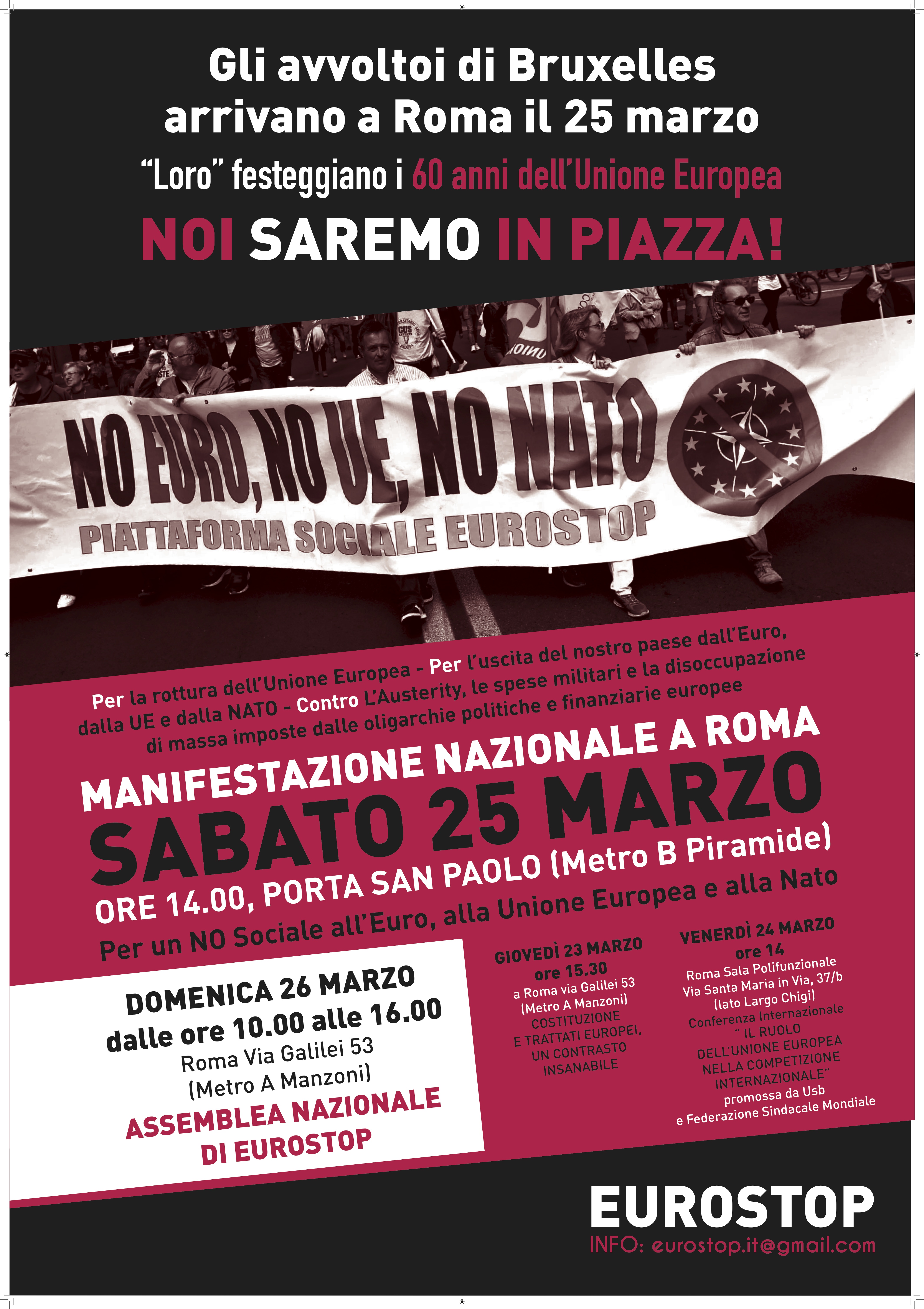 Sábado 25 de marzo, convocada por la Assamblea Nazionale di Eurostop, de 10 a 16  horas, manifestación en Roma con ocasión del encuentro de jefes de estado para celebrar los 60 años de la fundación de la hoy llamada Unión Europea.