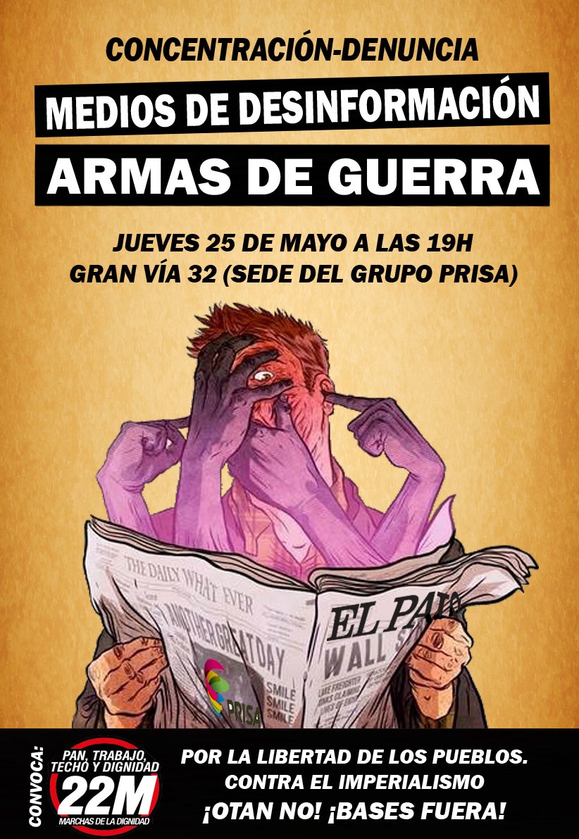 Las Marchas de la Dignidad convocan una concentración ante la sede en Madrid del Grupo PRISA (Gran Vía 32) para denunciar el papel que juegan los medios en la extensión de las injerencias, agresiones y guerras imperialistas en contra de los pueblos.