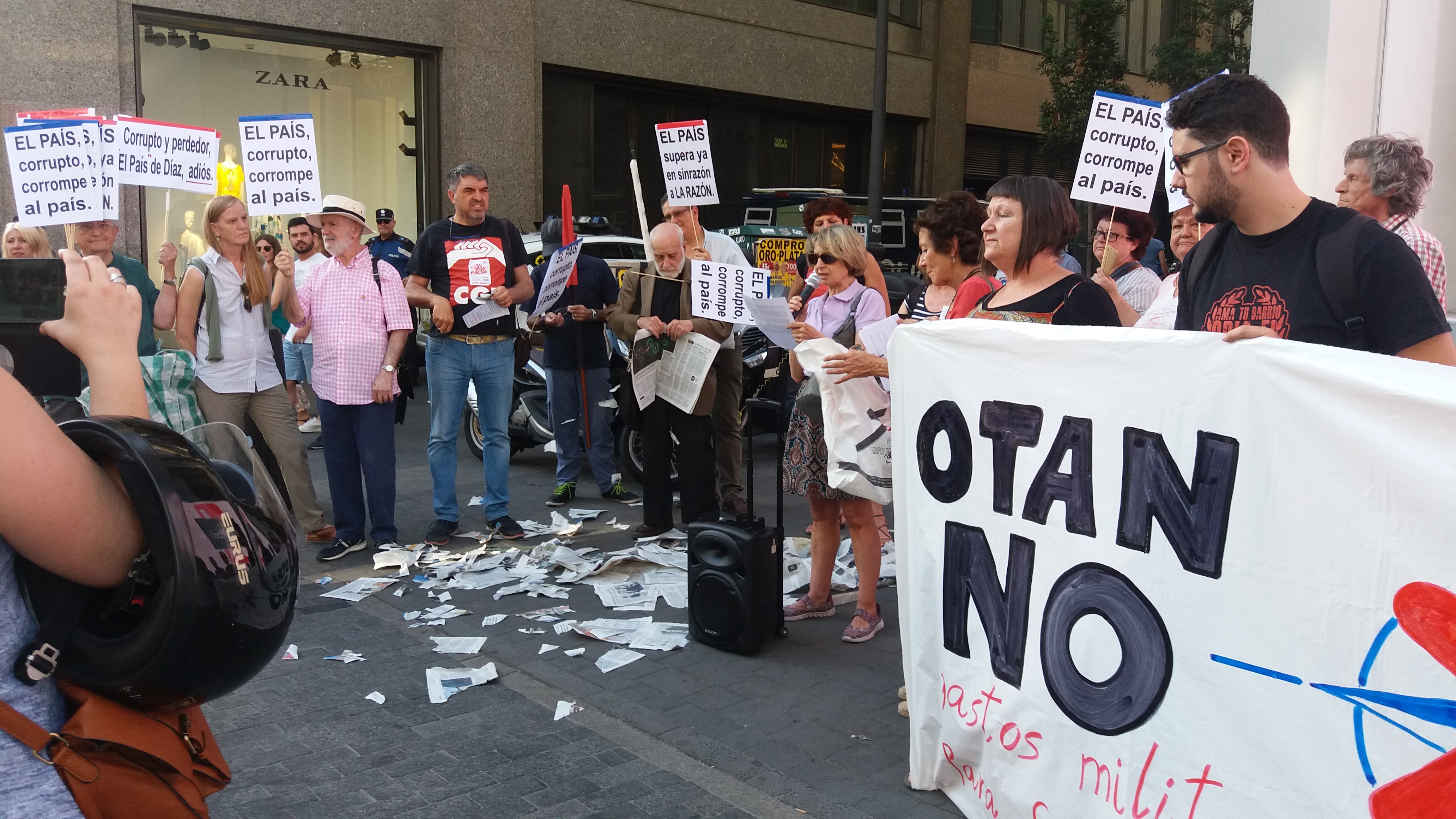 El acto vino precedido por otra concentración ante la sede del Grupo PRISA de la Gran Vía madrileña, convocada esta por las Marchas de la Dignidad en su semana de luchas, para denunciar la actuación de los medios de comunicación de masas como agentes de guerra que señalan los objetivos de las intervenciones y justifican las acciones criminales de los ejércitos imperiales.