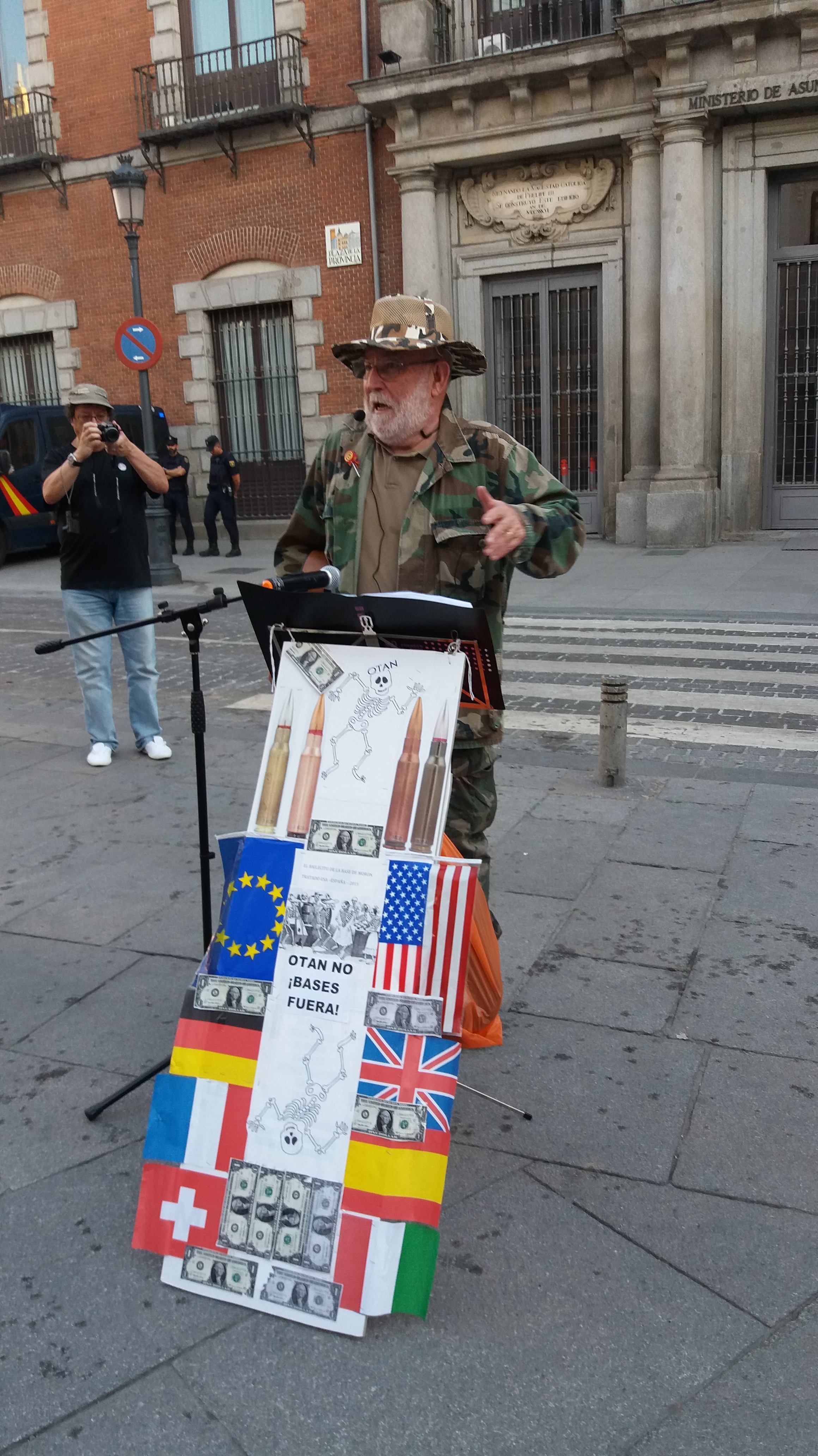 En la concentración propia, los grupos convocantes animaron a los transeúntes con una pantomima en la que se parodiaba la supuesta acción redentora y en favor de los derechos humanos y la democracia de las intervenciones militares de la OTAN y sus aliados.