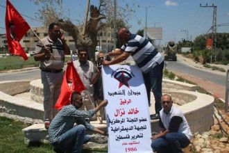 A Jaled Nazal, mártir palestino asesinado por el Mossad, sus compañeros del FDLP, sus amigos, su familia, le han homenajeado saliendo en manifestación y volviendo a poner en la plaza de Jenin la estatua.