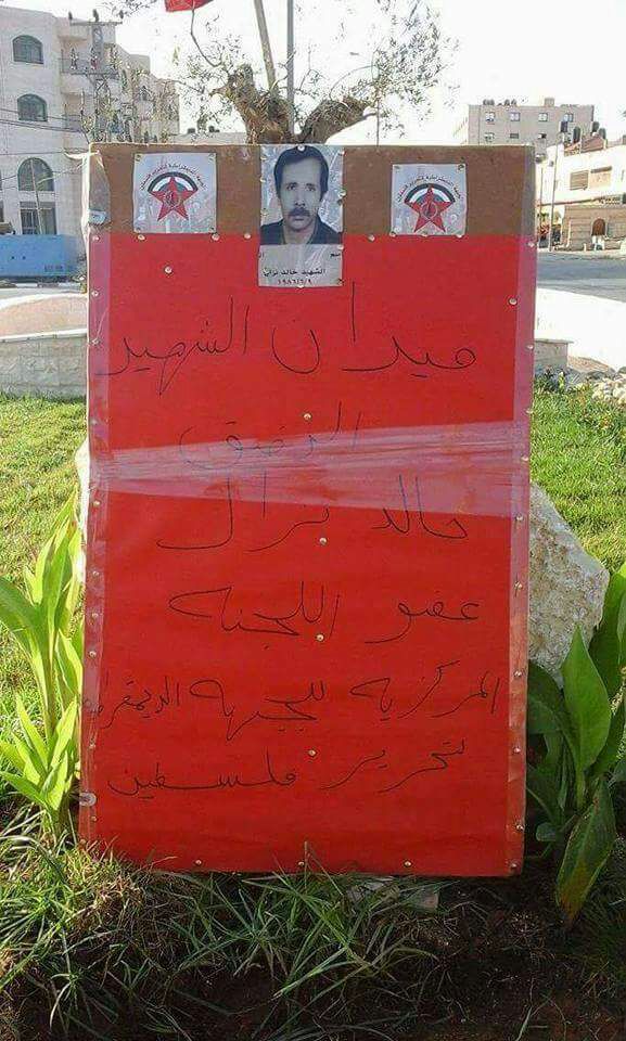 Hoy mismo se han colocado en el centro de la plaza de Jenin grandes fotos de la estátua y banderas, y en medio de una gran concentración popular se ha puesto otra estatua con el nombre del mártir Jaled Nazal.
