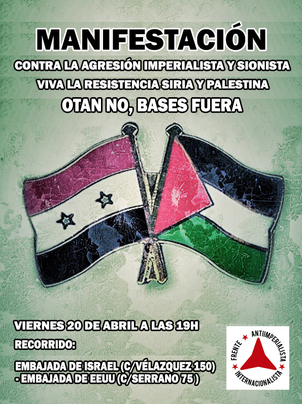 En el acto se leerán sendas declaraciones frente a las embajadas correspondientes. Se anima a la participación, portando símbolos, banderas palestinas y sirias y carteles alusivos a la criminal lógica imperialista.