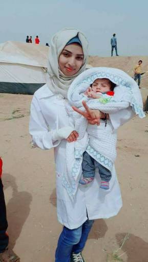 En éste 10º viernes del Retorno a Palestina en el que el pueblo reclamaba sus derechos legítimos y los criminales ya habían causado más de 100 heridos, una mercenaria sionazi ha clavado a sangre fría una bala en el corazón de una enfermera voluntaria que, como había hecho desde el primer viernes de la Gran Marcha del Retorno, acudió en auxilio de los heridos. Se llamaba Razan Ashraf Al Najar, su nombre alcanzaba la belleza que alcanza Palestina mártir, podría traducirse como “Nuestra balsa soñada”, o, “Nuestro estanque soñado”. Ha sido titulada por su pueblo como “El ángel de la Humanidad”. Tenía 21 años y un niño de 3 meses.